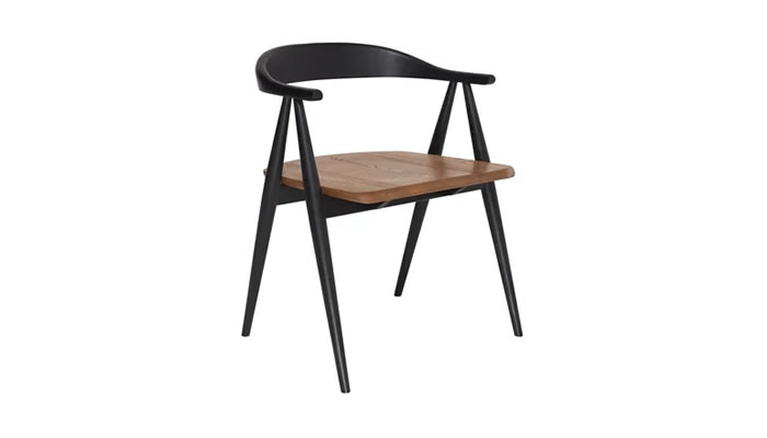 The ercol Monza Como dining chair has a bowed back and black frame made of ash, with juxtaposed, tapered legs and a striking brushed oak seat.