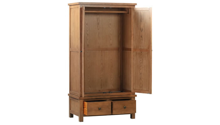 Dorridge Rustic Oak Bedroom Gents Wardrobe With 2 Drawers This Dorridge double sized wardrobe has both a hanging section with single full-width hanging rail and 2 deep drawers for additional storage.