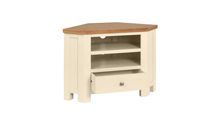 This corner TV Unit features two open sections each with a hole for wires and a drawer for extra storage. Clean straight lines with stylish panels and dovetailed drawers crafted from white oak, pine and MDF. Available in Ivory, White and Moon Grey.
