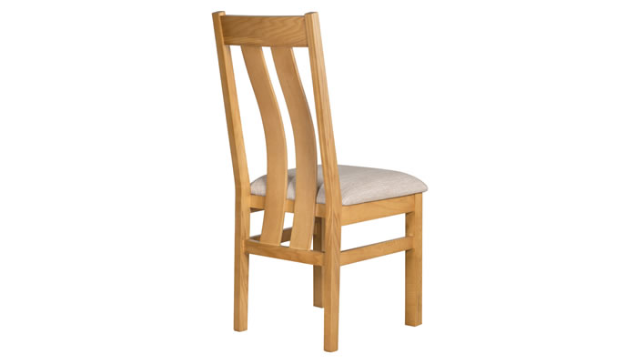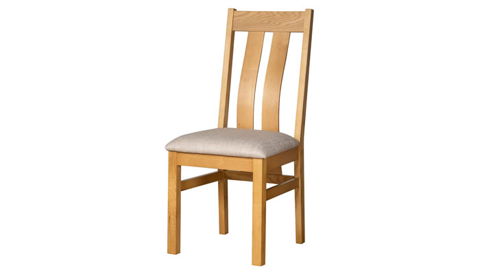 This Arizona dining chair has curved twin slat back for comfort with a fabric beige seat pad. Crafted from ash and is finished in a protective light lacquer.