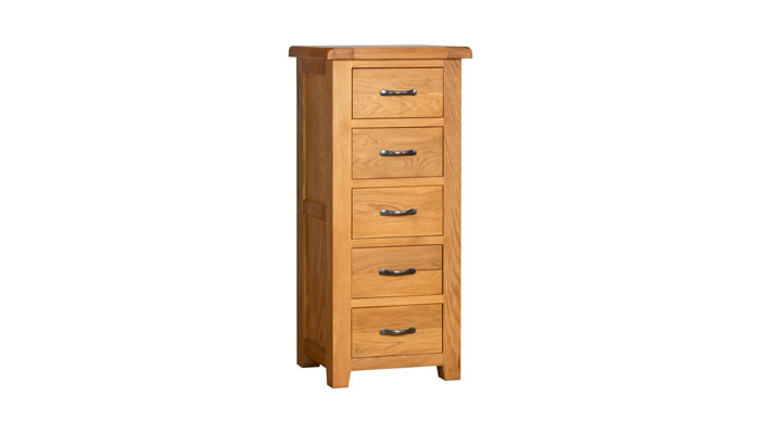 Southam Bedroom 5 Drawer Wellington The Signature Collection Southam 5 Drawer Wellington is made from white oak, chunky top with softened corners, tapered legs, dovetailed drawers and supplied with a rustic pull handle.