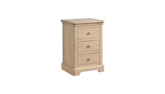 Leamington Oak Bedroom 3 Drawer Bedside The Signature Collection Leamington Oak 3 Drawer Bedside is made from white oak, pine and MDF. Finished in a protective pale oak lacquer and a choice of brushed metal or wooden knobs.