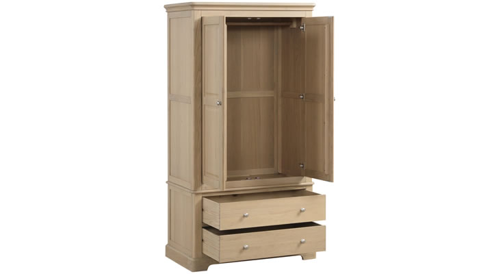 The Signature Collection Leamington Oak 2 Drawer Gents Double Wardrobe is made from white oak, pine and MDF. Finished in a protective pale oak lacquer and a choice of brushed metal or wooden knobs.